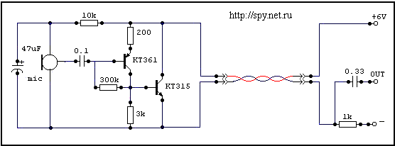 В помещении, за которым осуществляется контроль, находится микрофон и предусилитель. Из контролируемого помещения сигнал по проводам поступает к УЗЧ и источнику питания.