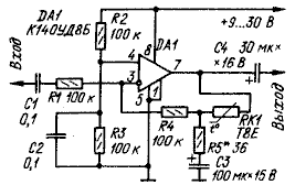 к импульсным помехам. Описанный компрессор может быть также использован в генераторах синусоидального напряжения для стабилизации амплитуды, в устройствах компандирования речевого сигнала в звукозаписывающей и радиопередающей аппаратуре. При использовании быстродействующего ОУ К574УД1 компрессор можно применить в РЧ тракте приемника в качестве усилителя с АРУ. А. Белоусов