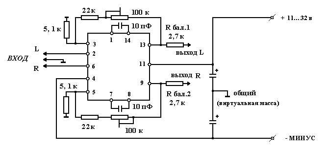 Какова емкость электролитов, образующих "виртуальную массу"? Вполне достаточно 10 мкФ, что бы все работало как надо, но я рекомендую увеличить их емкость до 330 мкФ что бы не допустить просадок при пиках сигнала.