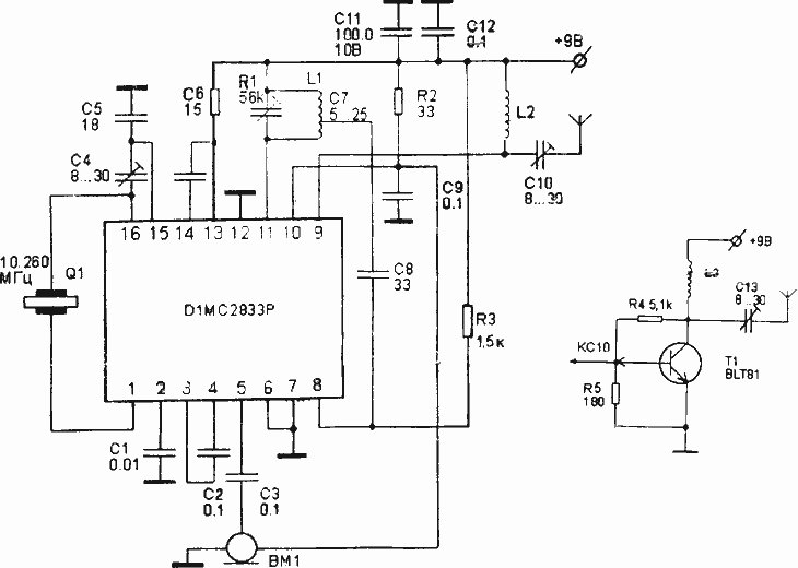 Передатчик (рис.1) собран на микросхеме МС2833Р, которая содержит генератор и усилитель РЧ, а также усилитель звука и модулятор. Назначение выводов микросхемы приведено в таблице. Микросхема имеет два свободновходовых транзистора, которые можно использовать в усилителе РЧ. При напряжении питания 9 В выходная мощность передатчика составляет 0,9 Вт. Работоспособность устройства сохраняется при падении напряжения питания до 3 В. Если применить дополнительный усилитель (рис.2) выходная мощность передатчика повышается до 5 Вт. Кварцевый генератор работает на частоте 10,260 МГц, контур L1C7 настроен на 7 гармонику. Можно применить кварц и на 27 МГц, изменив соответственно настройку контура.