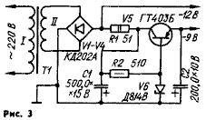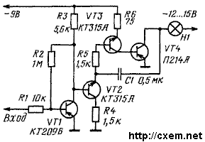 Цепи питания мультивибратора и ламп разделены, что позволяет питать лампы непосредственно от выпрямителя, а для питания мультивибратора использовать маломощный стабилизатор, рассчитанный на ток до 50мА, причем и лампы, и стабилизатор можно питать от одной вторичной обмотки сетевого трансформатора. Схема блока питания показана на рис. 3. Трансформатор Т1 выполнен на магнитопроводе сечением 19х38, сетевая обмотка содержит 1400 витков провода ПЭЛ 0,27, вторичная — 100 витков провода ПЭЛ 1,0. При этом в каждом канале трехканальной СДУ можно использовать до шести ламп МН13,5— 0,16, включенных параллельно. А. БЕЛОУСОВ Еще один вариант усилителя предложил В. В. Чернявский (см. рисунок ниже) Чувствительность этого усилителя 0,1...0,2 В, что позволяет подключить его к линейному выходу магнитофона или проигрывателя. Рабочее напряжение лампы Н1 12В, мощность 30 Вт.