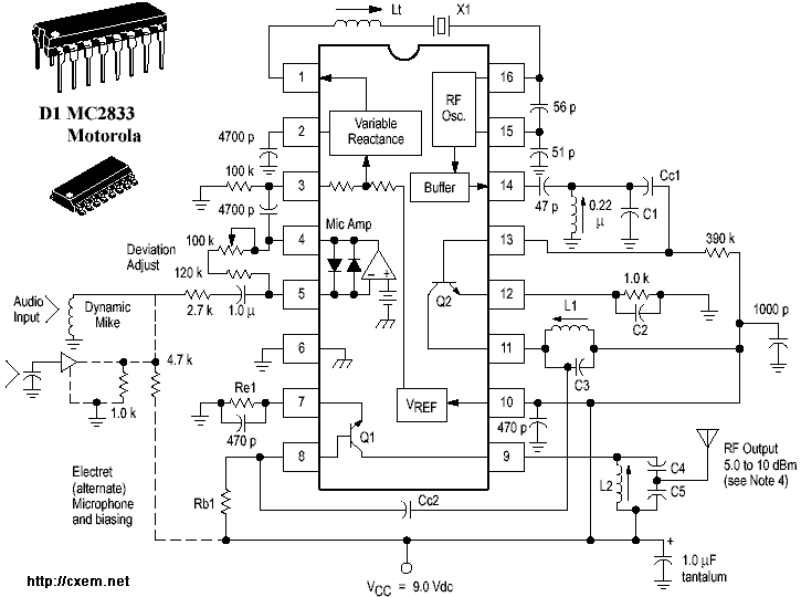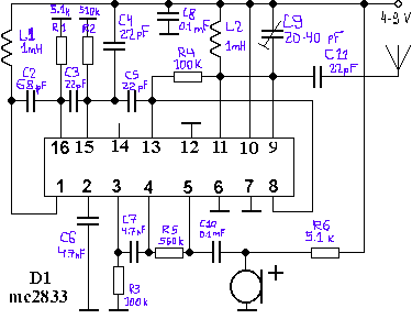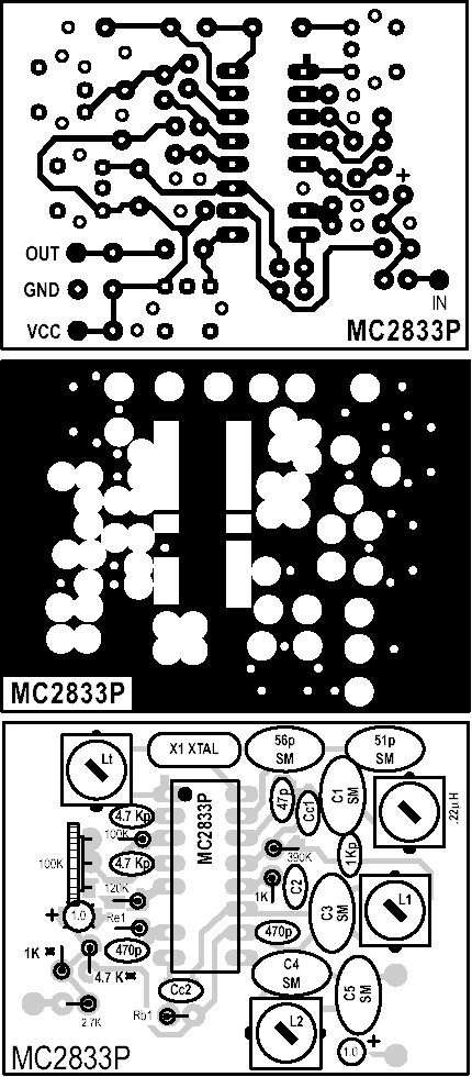 Т.к. приходит много писем по-поводу данной схемы - привожу дополненный рисунок, а также схему стандартного подключения и рисунки печатных плат для него. Данные взяты с сайта Motorola. Данную микросхему на радиорынке в Киеве я без проблем купил за 10 грн. (около $2). Если у Вас есть желание просмотреть оригинальное описание микросхемы, представленное фирмой Motorola - можете скачать mc2833.pdf (395 kB).