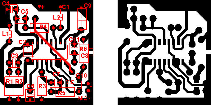 Хочу выразить огромную благодарность Стрельцову Ивану из Нефтеюганска, который прислал рисунки печатной платы передатчика. Ее размер 26 х 29 мм. Как видно из рисунка печатной платы - Иван использовал планарный корпус микросхемы MC2833. Если возникнут вопросы или конструктивные предложения - можете писать Ивану или мне.