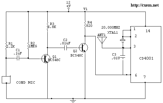 Задающий генератор работает на частоте 20 МГц, а для диапазона FM выделяется 5-ая гармоника. Транзисторы Q1 и Q2 выполняют роль усилителя НЧ и потом сигнал с резистора R4 поступает на вывод генератора чем обеспечивается нужная глубина модуляции.