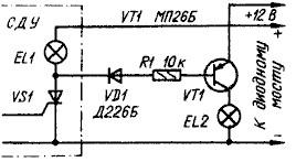 Как только открывается тринистор VS1 и включается одна из основных групп ламп EL1 (на схеме условно показана одна), открывается транзистор VT1 и загорается лампа EL2 контрольного экрана. Диод VD1 защищает базовую цепь транзистора VT1 от пробоя анодным напряжением закрытого тринистора VS1 (оно равно амплитуде сетевого, если лампы основного экрана питаются от сети). Лампу СМ10 можно заменить другой или несколькими, включенными последовательно, надо только иметь в виду, что общий ток через цепь ламп не должен превышать 200 мА, а напряжение питания транзистора должно быть равно общему напряжению на нагрузке плюс напряжение насыщения транзистора (напряжение питания не должно быть более предельно допустимого для транзистора). А. ШЕВЧЕНКО