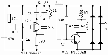 Думаю не стоит подробно описывать работу схемы, те кто инетересуются "схемами не для чайников" итак все поймут ;) Приведу лишь краткое описание. Катушки L1 и L2 содержат по 6 витков провода 0.5 на оправке 2.8мм (стержень от ручки). L3 - 8 витков на оправке 4мм (здесь можно экспериментировать тк от этой катушки фактически зависит дальность приема). Диоды - КД521в или буржуйские 1N4148. Иногда может быть необходимо подобрать напряжение на диодном мосте в пределах 12в (ведь на буржуйских линиях напряжение ниже чем на наших), зашунтировав его резистором 0.2-1k. Аналог транза ВС547 - КТ3102. вот фотография оригинала (собрано из набора):