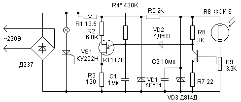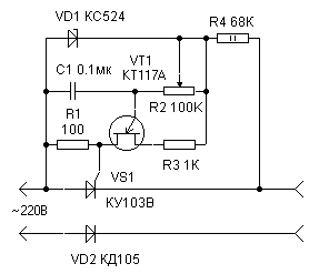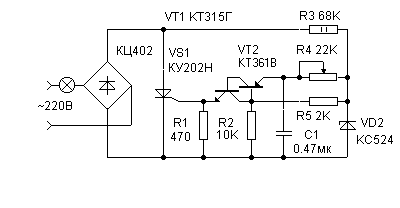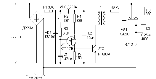 работает следующим образом. Положительная полуволна питающего напряжения проходит в нагрузку практически без ослабления через диод VD2. Релаксационный генератор питается пульсирующим напряжением (в течениие отрицательной полуволны), ограниченным стабилитроном VD1 на уровне 24В. С появлением каждой отрицательной полуволны конденсатор С1 начинает заряжаться через цепь R2, R4. Скорость зарядки можно регулировать переменным резистором R2. Как только напряжение на конденсаторе достигнет порога открывания транзистора VT1, на управляющий электрод тиристора VS1 поступает положительный импульс и тиристор открывается до конца полупериода. Таким образом, изменением постоянной времени фазосдвигающей цепи R2C1 осуществляктся регулировние мощности, отдаваемой в нагрузку. Простой светорегулятор на эквиваленте ПОПТ: