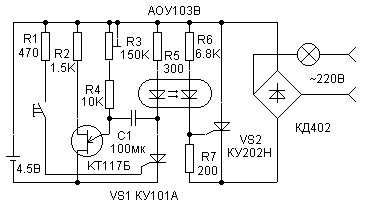Такой автомат может использоваться, например в общих коридорах с целью экономии электроэнергии. Необходимое время включённого состояния устанавливается подстроечным резистором R3. После заряда конденсатора до напряжения включения ОПТ, т.е. после его включения, конденсатор С1 на короткое время создаёт на аноде тиристора VS1 отрицательное напряжение и тем самым выключает его. Простой автоматический регулятор освещённости: