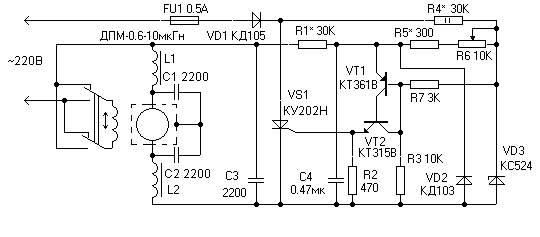 Все три обмотки импульсного трансформатора Т1 содержат по 100 витков. При этом мощность нагрузки можно увеличить до 2кВт. В заключении необходимо отметить, что все рассмотренные регуляторы мощности имеют один существенный недостаток - создают большие импульсные радиопомехи как в сети, так и в окружающем пространстве, т.к. выключение симистора или тиристора происходит по окончании полупериода, а их включение, за счёт фазового регулирования, в пределах полупериода. Интенсивность радиопомех зависит от амплитуды мгновенного напряжения, при котором открывается тиристор, мощности нагрузки, длины соединительных проводников и ряда других причин. Отсюда следует, что максимальные помехи возникают на среднем участке регулировочной характеристики.