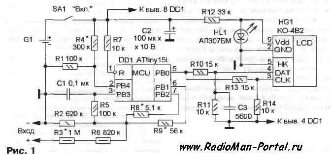 В устройстве также предусмотрено измерение напряжения аккумулятора G1 с точностью до сотых долей вольта. Для этого напряжение, пропорциональ¬ное напряжению аккумулятора, с резистивного делителя R1R4 поступает на вход РВ4, который программно сконфигурирован как еще один вход встроенного АЦП. Вся информация отобража¬ется на десяти разрядном ЖК индикаторе HG1. В левой его части — напряжение аккумулятора, а в правой — измеряемого напряжения.