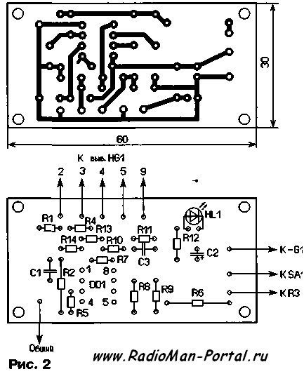 Большинство элементов, кроме аккумулятора G1, выключателя питания SA1, индикатара HG1 и резистора R3, смонтированы на печатной плате из односторонне фольгированного стеклотекстолита, чертеж которой показан на рис. 2. Плата установлена в пластмассовый корпус подходящего размера. Применены резисторы Р1-4, МЛТ, С2-23, оксидный конденсатор — импортный, конденсаторы С1, СЗ — К10-17. ЖК индикатор — КО-4В2 (с контроллером W-1611-04) или НТ-1611, выпускаемые фирмой "Телесистемы". Светодиод, выключатель питания и аккумулятор от сотового телефона могут быть любого типа.