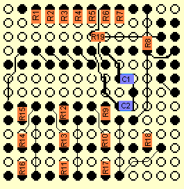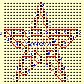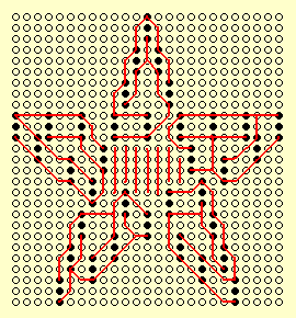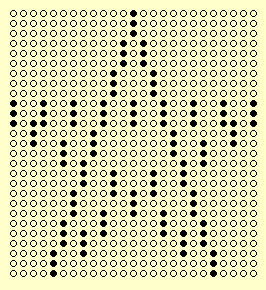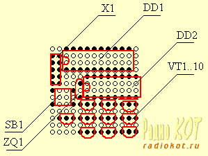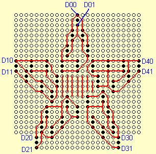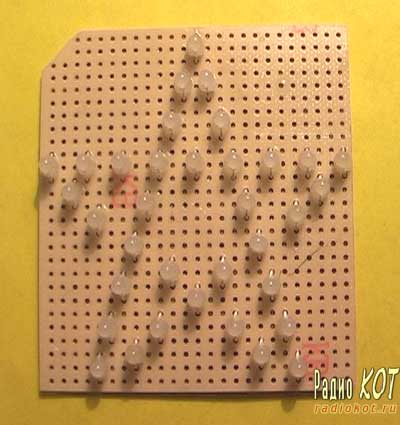 Ну чего, поехали! Сначала берем двуцветные светодиоды (они выглядят примерно так): ![]() И кусок макетки 25х27, который выглядит как кусок макетки. Устанавливаем на нем светодиоды в примерно следующем порядке: ![]() Чтобы вам было легче устанавливать – вот чертеж. Черным обозначены те дырки, в которые просовываются лапки светодиодов: