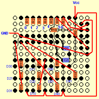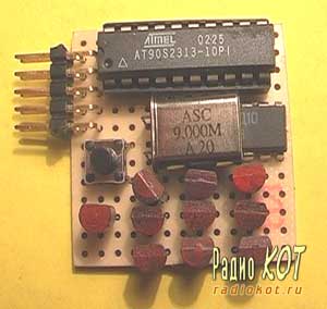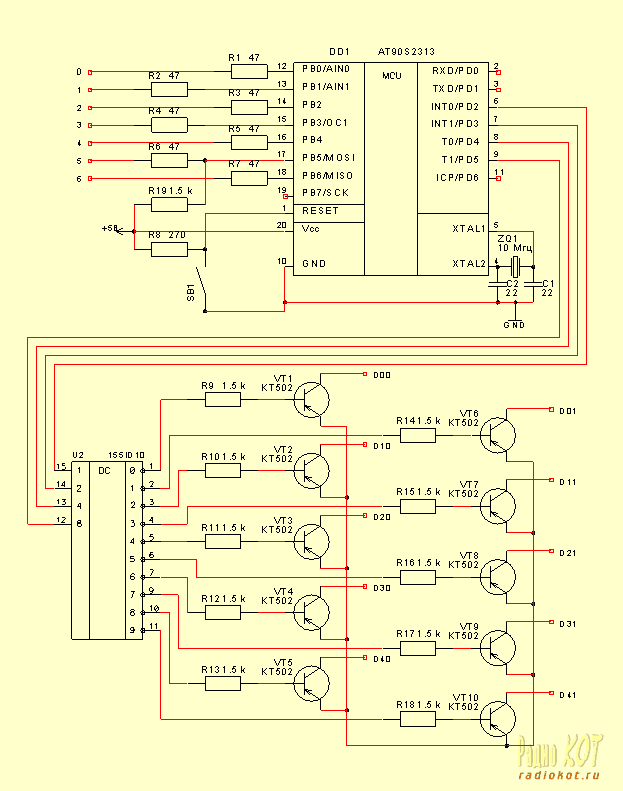 Выводы светодиодов расположены так: в середине общий (катод) по краям – аноды. ![]() Устанавляваем диоды так, чтобы у всех диодов аноды одного цвета были сверху, другого – снизу, что избавит нас от лишней головной боли при их соединении. Это легко сделать, поскольку выводы имеют различную длину (не просто так, а для того чтобы их различать). Кроме того, если присмотреться, можно заметить различия у основания выводов. Ну значит, устанавливаем, лишнее откусываем, запаиваем. Получается что-то вроде: ![]() теперь скручиваем три жилки монтажного провода МГТФ, залуживаем его и проводим соединения согласно чертежу (ну или придумайте свой): ![]() ВИД СНИЗУ Сделали - промываем спиртиком или ацетончиком, проверяем. Берем снова монтажный провод, только теперь не размочаливаем его на жилки – а юзаем целиковый. Соединяем то что еще не соединили. На следующем чертеже показаны точки соединения. Они также пронумерованы на схеме. ![]() Все. Звездочка готова. Еще раз моем ее в ацетоне. Затем отпиливаем лишнее, чтобы получилось нечто, похожее на пятиконечную советскую звезду. Отпиливаем аккуратно – чтобы не убить монтаж и светодиоды. Обрабатываем напильником. Должно получиться где-то наподобие: ![]() Теперь надо сделать схему управления. Схема управления ![]() Вдумчиво читаем схему. Что непонятно? Поясняю: точки 0…6 – это точки подсоединения общих катодов. Они совпадают с соответствующими точками чертежа платы звездочки. Точки D 00… D 41 подключаются к группам анодов лучей звезды. Первая цифра означает номер луча, вторая – группу анодов. Смотрим чертеж, чтоб понять: ![]() Кроме того, на схеме не изображен разъем программирования, который подключается к выводам контроллера: MOSI , MISO , SCK , Reset . На плате этот разъем есть, он обозначен X 1. Ну все, можем продолжать! Да, кстати, список того, что нам нужно на данном этапе (вначале уже об этом говорили вскользь, сейчас – поконкретнее):