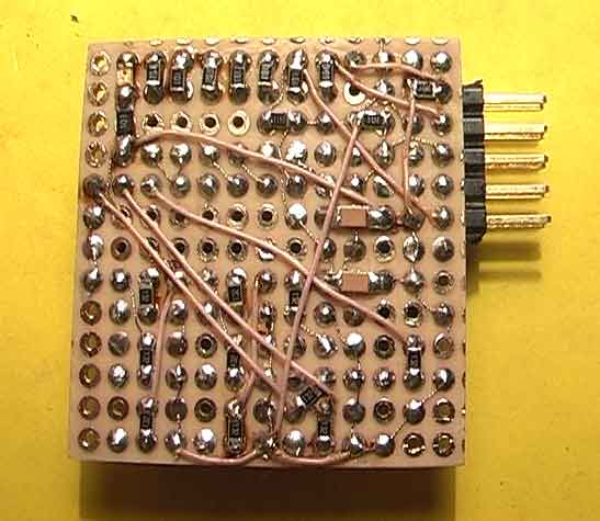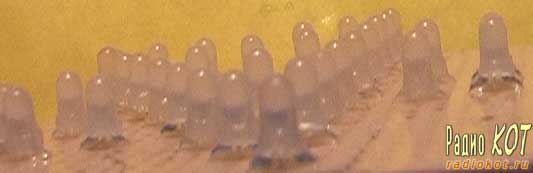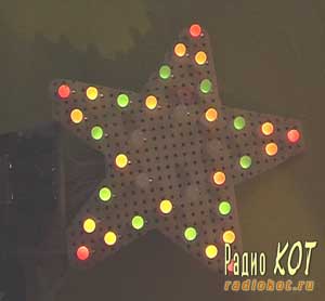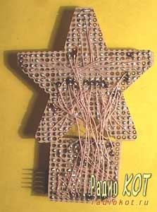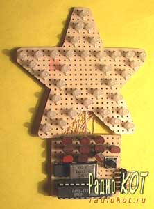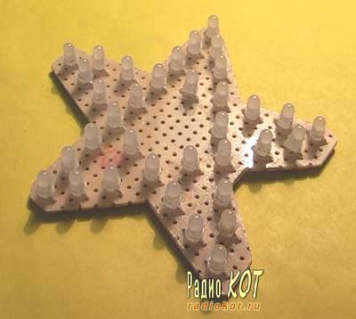 Ну а теперь – берем второй кусок макетки, который 13х13. Вываливаем на стол детали. Устанавливаем: ![]() Устанавливаем. Запаиваем. Запаяли? Сверяемся: ![]() Моем, проводим жилками соединения, а также впаиваем SMD -резисторы и конденсаторы. Резисторы показаны рыженьким, конденсаторы – синеньким. Лучше всего брать SMD -компоненты типоразмера 0805, ну или на худой конец 0603. На 1206 не соглашайтесь – они не влезают между двух пятачков макетки. Смотрим чертеж, паяем. ![]() Моем, тянем проводочки (обозначены красным): ![]() Ну вот и все! У вас должно получиться приблизительно так: ![]() Осталось только соединить соответствующие точки на двух платах – и можно делать первое включение. ![]() ![]() Правда при первом включении светодиоды не зажгутся: у нас же еще контроллер не прошит. Так что, покамест мы можем только проверить девайс с точки зрения «не греется ли чаво». Хотя… Ладно, так и быть – вот вам тестовая программа прошивки. Если все правильно работает – звездочка должна светиться вот так: ![]() Пока все. Как только напишется софт – будет продолжение. Кстати – как вы поняли, все это безобразие управляется контроллером. А это дает возможность реализовать самые сумасшедшие идеи в области светодинамики. У меня конечно есть своя фантазия… точнее – генератор бредовых идей. Но я бы хотел услышать также мнение общественности. А именно – реализацию каких эффектов общественность хотела бы получить в этом девайсе. Источник: www.radiokot.ru