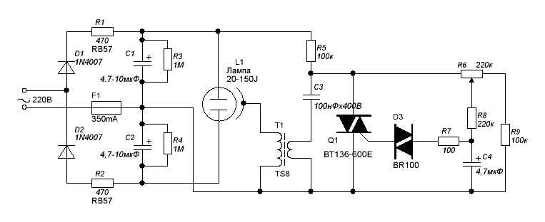 сетевого напряжения, резисторы R1 и R2 ограничивают мощность, передаваемую