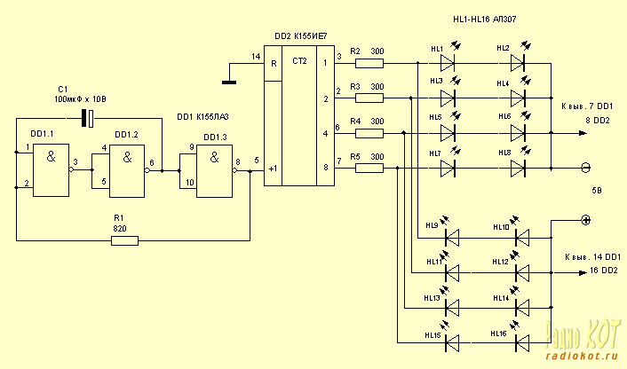 переключал выходы. Кстати, в качестве эксперимента можешь попробовать забабахать вместо постоянного резистора R1 переменный, величиной 4,7 кОм. Светодиоды на выходе счетчика включены в противофазе друг другу, так что, например, при 1 на выводе 3 DD2 горят HL1 и HL2, а при 0 HL9 и HL10. Так же и с остальными выводами. Светодиоды - практически любые, разных цветов. Источник: www.radiokot.ru