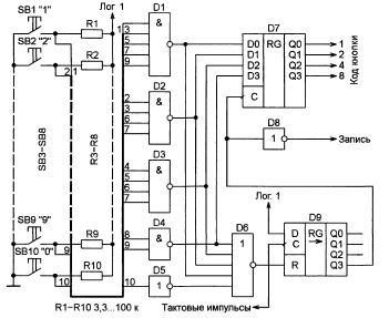 Б. СОКОЛ, д. Чашниково Московской обл. В предлагаемом узле использован метод подавления "дребезга" контактов кнопок, не требующий использования конденсаторов. Это позволяет встраивать его в ПЛИС, содержащие, как известно, только активные логические элементы и не рассчитанные на подключение внешних пассивных вре-мязадающих цепей. Схема узла показана на рисунке. При нажатиях на кнопки SB1—SB9 он формирует на выходах 1, 2, 4, 8 двоично-десятичные коды цифр, соответствующие номеру нажатой кнопки. При нажатии на SB10 выдается нулевой код.