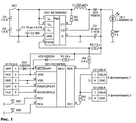 Пульт (рис. 1) содержит батарею питания напряжением 3 В, состоящую из двух гальванических элементов G1 и G2 типоразмера AAA, повышающего до 5 В преобразователя на микросхеме DA1, микроконтроллера DD1 фирмы Microchip и двух выходных разъемов USB-A (X2 и ХЗ) для подключения фотоаппаратов. Выходной сигнал пульта рассчитан для работы с фотоаппаратами в режиме скриптов (меню "Scripting parameters" CHDK [5]).