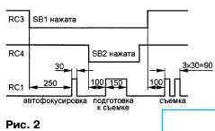 Диаграмма входных сигналов (порты RC3 и RC4 микроконтроллера DD1) и выходного сигнала с порта RC1 DD1 показана на рис. 2. Длительность временных интервалов приведена в миллисекундах. При нажатии на любую из кнопок SB1 или SB2 микроконтроллер DD1 переключает порт RA5 в состояние низкого уровня, запуская повышающий преобразователь на микросхеме DA1. Напряжение питания микроконтроллера DD1 при этом повышается до 5 В (определяется соотношением R5/R4). Далее, через 25 мс (пауза, перекрывающая время нарастания напряжения питания), микроконтроллер формирует первый импульс длительностью 30 мс — команду автофокусировки фотоаппаратов.