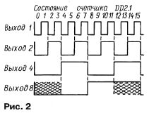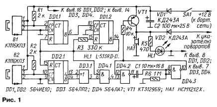 дении давления. Но, как показывает практика, установка этого устройства на свой автомобиль станет весьма интересным и полезным дополнением к имеющимся приборам контроля. Схема простого прибора контроля давления для двух задних или двух передних колес представлена на рис. 1. Импульсные сигналы с датчиков Холла В1, В2, установленных по одному на каждое колесо, поступают на входы двух двоичных счетчиков DD1.1, DD1.2 и DD2.1. Один импульс каждого датчика соответствует одному обороту колеса. Первый счетчик считает до 128 — до появления высокого уровня на выходе старшего разряда — и формирует короткий обнуляющий импульс, по фронту которого происходит сравнение состояния второго счетчика относительно DD1.1. Предполагается, что разница между числами импульсов датчиков на момент сравнения не превышает двенадцати, поэтому достаточно сравнить четыре младших разряда первого счетчика, а второй счетчик выполнить четырехразрядным. В зависимости оттого, в каком колесе снизилось давление, второй счетчик будет либо отставать от первого, либо опережать его. Поскольку обнуляющий импульс появляется в момент перехода счетчика DD1.1 в нулевое состояние, фактически происходит определение, насколько состояние счетчика DD2.1 отличается от нулевого в ту или иную сторону. Рассмотрим кратко работу узла сравнения в четырех возможных ситуациях: