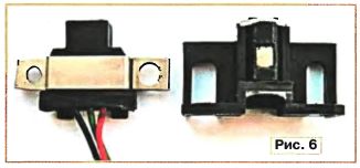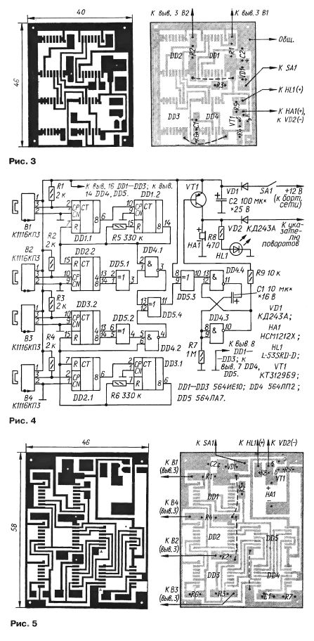 Например, для R = 25 см, получаем R1 = 24 см. То есть прибор подаст сигнал тревоги при уменьшении радиуса на 1 см и более. Из формулы следует, что чувствительность прибора зависит от коэффициента счета, равного 128, который определяет число оборотов колес до очередного момента сравнения. С увеличением этого коэффициента чувствительность повысится, но увеличится и вероятность ложного сигнала тревоги при движении автомобиля по кривой, поскольку соответственно увеличится длина пути между моментами сравнения. Прибор может быть собран на плате из фольгированного стеклотекстолита толщиной 1 мм. Чертеж платы показан на рис. 3. Все детали и перемычки распаяны поверхностным монтажом. Вместо КД243А можно использовать диоды 1N4001. Используя свободные элементы и добавив одну микросхему 564ИЕ10, получим вариант устройства на четыре колеса (см. схему на рис. 4). Прибор содержит два описанных выше одинаковых независимых узла сравнения с общей звуковой и световой индикацией. Сигналы с обоих узлов поступают на входы элемента DD5.4. Элемент DD5.3 выполняет роль инвертора, обеспечивающего требуемый уровень импульса, который запускает одновибратор, собранный на элементах DD4.3, DD4.4. Чертеж печатной платы для четырехколесного варианта прибора представлен на рис. 5. В обоих устройствах использованы резисторы Р1-12-0,125, конденсаторы К10-17 типоразмера 0805 или 1206 и оксидные типоразмера А или В. Звукоизлучатель подойдет любой, рассчитанный на питание напряжением 12 В. Вместо L-53SRD-D можно использовать любой светодиод красного свечения. Прибор может быть установлен на автомобиль любой марки, в том числе и на грузовой. В качестве датчиков В1 — В4 использованы датчики Холла, применяемые в электронной системе зажигания автомобилей "Жигули", или любые другие. От каждого датчика отпиливают ту часть, где находится магнит, как показано на фото рис. 6. Магнит фиксируют на вращающейся детали колеса, например, на тормозном барабане, а собственно датчик (с выводами) — на тормозном суппорте. Под датчик нужно поместить прокладку толщиной 3...5 мм из любого пластика, а крепежную скобу изготовить из латуни или меди. В каждом случае при выборе места и способа крепления датчика и магнита может быть индивидуальный подход. Главное требование: при вращении колеса обеспечить между ними зазор в пределах 1...3мм. Необходимо также сохранить ту же ориентацию магнита, которая была до его отпиливания. На переднеприводной модели автомобиля на передних колесах каждый магнит удобно крепить на ШРУСе с помощью стандартного хомута, а сам датчик — на корпусе коробки передач на жестком кронштейне из немагнитного металла. Датчик системы зажигания изготовлен на базе микросхемы К1116КПЗ. Он