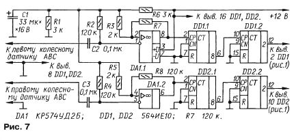 гидропривода тормозов. Отрезок соединения между датчиком и кабелем на корпусе необходимо выполнять гибким эластичным кабелем в морозостойкой изоляции. Места соединений надежно фиксируют механически и защищают от влаги. Если прибор контроля давления предполагается установить на автомобиль, оснащенный антиблокировочной тормозной системой (ABS), устройство придется усложнить, зато отпадет необходимость в приобретении и трудоемком монтаже датчиков. В этом случае лучше использовать импульсы с датчиков ABS, имеющие, как правило, амплитуду 100...500 мВ. Входную часть каждого канала прибора нужно будет дополнить компаратором и предварительным делителем частоты. На рис. 7 показан вариант схемы прибора для одной пары колес. Резисторы R1, R2 (см. рис. 1) исключаются. Компаратор DA1.1 преобразует входной аналоговый сигнал в цифровой с необходимыми логическими уровнями. Для повышения помехоустойчивости работы компаратора введена слабая положительная ОС через резисторы R3, R7.