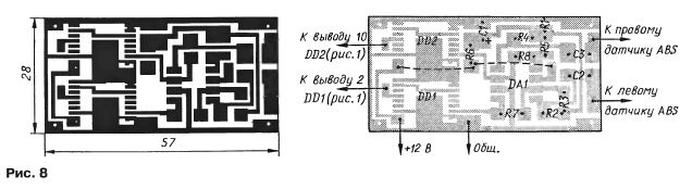 Датчик ABS формирует от 50 до 80 импульсов сигнала за оборот колеса в зависимости от модели автомобиля. Поэтому коэффициент деления предварительного делителя частоты DD1.1, DD1.2 выбран равным 64, чтобы на выходе (вывод 12) получить один импульс за примерно один оборот колеса, что и требуется для работы прибора. Чертеж печатной платы входных цепей двух каналов представлен на рис 8. Для четырехколесного прибора таких плат понадобится две. Для монтажа микросхемы КР574УД2 ее выводы необходимо отформовать для пайки к контактным площадкам. Узел можно собрать на ОУ К1407УДЗ, К574УД2, TL083 с соответствующей коррекцией рисунка проводников платы. В автомобиле с ABS прибор следует монтировать вблизи электронного блока системы, где сходятся сигналы со всех датчиков. Наличие разделительных конденсаторов и большое входное сопротивление компараторов позволяют подключать прибор к ABS, не опасаясь нарушить работу системы. Напряжение питания прибора в этом случае удобно снять с блока ABS. Кроме описанного выше прибор может дублировать звуковым и световым сигналами включение указателя поворотов автомобиля. Для этого соответствующий вывод прибора подключают к контрольной лампе на щитке приборов (один из выводов лампы должен быть соединен с корпусом автомобиля). Индикатор HL1 прибора следует монтировать на приборном щитке, а НА1 — за щитком, но так, чтобы его хорошо слышать. Для проверки работы прибора после установки на автомобиль достаточно проехать несколько раз по кругу радиусом 6...8 м, при этом должны включиться звуковой сигнал и светодиод. Несмотря на простоту, прибор вполне справляется с поставленной задачей. Если при движении по трассе прозвучал сигнал тревоги, да еще не один, а два раза подряд, то можно смело останавливаться и вынимать домкрат. Ложные срабатывания происходят редко. Чтобы их исключить совсем или сократить до минимума, можно усложнить прибор, добавив обнуление счетчиков при нажатии на педаль тормоза, при включении указателя поворотов или изменить алгоритм работы, например, накапливать число ошибок до двух-трех и т. д., но это уже задача для микроконтроллера.