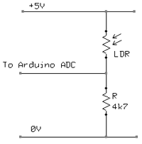 Принципиальная схема делителя показана ниже. Когда освещенность увеличивается, сопротивление фоторезистора падает и соответственно на выходе делителя (и входе АЦП) напряжение увеличивается. Когда освещенность падает все наоборот.