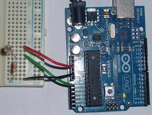 На фото ниже, показана собранная схема на макетной плате. Напряжения 0В и 5В берутся с Arduino. Ножка А0 используется как вход АЦП.
