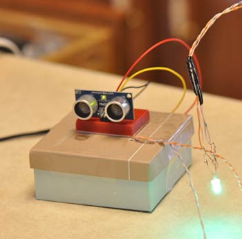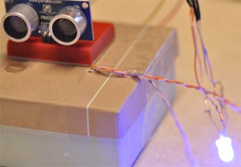 5. Теперь осталось дело за программой. После тестирования ПО, если все нормально работает, то закрепите датчик на стене вашего гаража, а светодиод выведите в удобное для вас место. ПрограммаК счастью, софт Arduino уже содержит пример для работы с ультразвуковым датчиком. Пример этот находится: File -> Examples -> Sensors -> Ping example. Откройте этот пример и скопируйте весь код в новый проект. Назовите его как-нибудь (к примеру Parking Example) и сохраните. Внесем некоторые изменения в программу. Для начала мы увеличим интервал посылок к датчику, т.к. нам не нужно посылать сигнал каждые 100 мс, достаточно и 1 секунды. delay(1000); Далее, мы должны установить номера выводов для светодиода. Для этого перед строкой const int pingPin = 7;добавьте: pinMode(13, OUTPUT); // синий pinMode(12, OUTPUT); // зеленый pinMode(11, OUTPUT); // красный Теперь мы должны определиться, при каком расстоянии, какие цвета светодиода будут показываться. К примеру я сделал так: дальше чем 60 см от стены горит зеленый цвет, когда остается меньше 60 см, загорается синий цвет, а когда до стены остается менее 15 см загорается красный цвет. Наш код с учетом вышеприведенных вычислений будет таким: