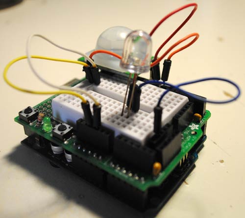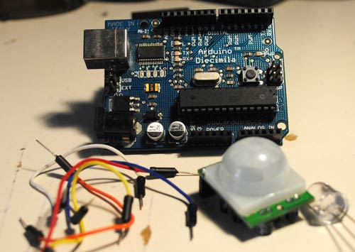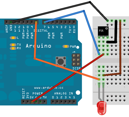 PIR-сенсор имеет 3 вывода: плюс, минус и выход. К 7-му выводу Arduino подключаем выход PIR-сенсора. Также, присоединим светодиод к выводу 8 Arduino и GND. Исходный код программы взят с официального сайта arduino.cc: