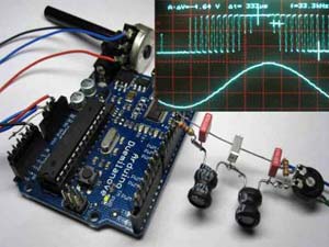 Для работы данного скетча на Arduino Diecimila или Duemilenove подключите потенциометр к аналоговому выводу 0 и к GND и +5В. Выход генератора находится на выводе 11, куда вы можете подключить активные колонки, или ФНЧ фильтр описанный ниже.