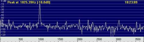 Спектрограмма показала неожиданно хороший результат. Большой пик - это на частоте около 1000 Гц. Все нежелательные искажения находятся ниже 50 дБ, возникшие из-за того, что использовался 8 битный ЦАП (1/256 = 48 дБ).