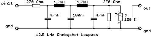 Для начала, вы можете подсоединить 11 пин контроллера к активным колонкам. Но скорее всего, вам еще понадобится ФНЧ-фильтр, который также будет отфильтровывать частоту дискретизации 32 кГц. Ниже представлена схема такого фильтра с частотой среза 12 кГц.