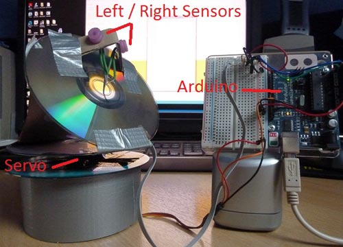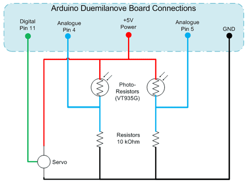В проекте используется два датчика-фоторезистора, которые направлены в разные стороны от плоской поверхности на 45°, т.е. относительно друг-друга фоторезисторы сориентированы на 90°. На сами датчики надеты колпачки, чтобы поток света, падающий на них был узконаправленным. В проекте используется контроллер Arduino. Контроллер периодически считывает значения с двух датчиков и сравнивает их. Если значения с датчиков одинаковы, значит панель наведена на солнце. В случае, если значение одного из датчиков отличается от другого, контроллер дает команду на серводвигатель для поворота платформы. Команда на серво работает до тех пор, пока значения с датчиков не сравняются.