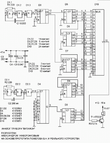 Это обычный генератор, выдающий ряд частот от 60 Гц до 12,5 кГц, собранный на обычных ТТЛ микросхемах. Эту конструкцию можно было собрать и на аналоговых элементах, и на PIC контроллерах, но я просто использовал детали, лежавшие в моем столе долгое время без всякого движения. Сигнал частотой 50 кГц с генератора D1 идет на делитель D3 а с него меандр 25кГц поступает на счетчикиD5, D6 а меандр 16 кГц на D7, D8. С выходов счетчиков сигналы идут на входы мультиплексора D10. Мультиплексор переключает свои каналы согласно сигналам со счетчика D9. Сигнал частотой 12 Гц с генератора D2 идет на D4 . Здесь использована 155ИЕ8 как делитель на 64, так как трудно получить устойчивую генерацию 0,2 Гц. Как излучатель сначала я использовал ЗП-3 но затем поставил телефонный капсюль ТК-67 и мощность излучения сильно возросла несмотря на потерю энергии излучения в области верхних частот. С капсюля я снял верхнюю крышку и закрепил мембрану изолентой по краям. Прибор используется у нас в семье и действительно помогает против фурункулов, простуды, боли в спине и т.д.