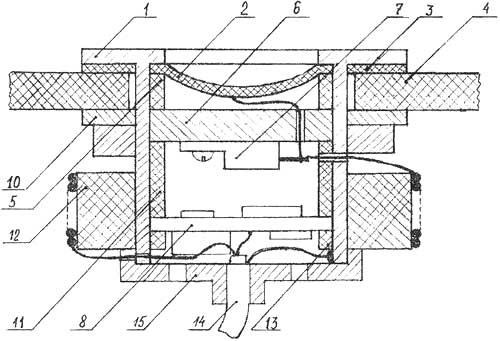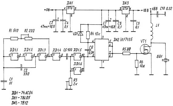 На элементах DD1.1-DD1.3 собран генератор прямоугольных импульсов на частоту 1,8...2,0 МГц. Микросхема DD1 типа 74АС04 на комплементарных полевых транзисторах со структурой металл-окисел-полупроводник, являющаяся вариантом широко распространенной серии транзисторно-транзисторной логики SN74, позволила получить крутые фронты импульсов, малый ток потребления, небольшие номиналы частотно-задающих элементов по сравнению с генератором, выполненном на микросхеме SN7404 (К155ЛН1). Элемент DD1.4 - буферный. С выхода DD1.4 импульсы поступают на дифференцирующую цепь C5R3. Изменяя постоянную времени RC-цепи с помощью подстроечного резистора R3, можно менять длительность импульсов на выходе элементов DD1.5, DD1.6, следовательно, будет меняться скважность импульсов от 0 до 2. Таким образом, регулируется мощность, подаваемая на пьезоизлучатель BQ1, и количество генерируемых отрицательных аэроионов. Так как порог открывания мощного MOSFET-транзистора VT1 около 5 В, и для быстрого открытия и закрытия транзистора нужны значительные токи, необходимо использовать усилитель. В качестве него применена микросхема DA2 IRF7105, состоящая из двух полевых транзисторов: n-канального и р-канального. Характеристики n-канального транзистора: ток стока 3,5 А, рассеиваемая мощность 2,0 Вт. Характеристики р-канального транзистора: ток стока 2,5 А, рассеиваемая мощность 2,0 Вт. Такой величины тока, при напряжении питания DA2 12 В, вполне достаточно, чтобы быстро перезаряжать входную емкость MOSFET-транзистора. При низком логическом уровне на выходе DD1.5, DD1.6 открывается р-канальный транзистор в DA2. При этом на затвор транзистора VT1 через резистор R5 подается +12 В, и транзистор VT1 открывается. При высоком логическом уровне на выходе DD1.5, DD1.6 открывается n-ка-нальный транзистор в DA2. В этом случае затвор транзистора VT1 через резистор R5 соединяется с общим выводом источника питания, и транзистор VT1 закрывается. При закрытом MOSFET-транзисторе заряжается статическая емкость пьезоэлемента BQ1 через индуктивность L1. При открытом транзисторе VT1 статическая емкость пьезоэлемента BQ1 разряжается. При этом пьезоэлемент испытывает деформацию. Колебания пьезоэлемента с ультразвуковой частотой создают в жидкости продольные упругие волны. При расположении пьезоэлемента на дне емкости и заполнении ее водой на уровень, равный фокусному размеру пьезоэлемента, с поверхности воды будет подниматься небольшой фонтан, сопровождающийся туманом - мелкодисперсными каплями воды. Эти капли воды являются носителями отрицательных аэроионов. В конструкции (рис.2) использован излучатель вогнутой формы диаметром 30 мм и фокусным расстоянием 70 мм из пьезокерамики ЦТС на частоту 1,8...2,0 МГц. В корпус из латуни 1 вклеен с помощью токопроводящего клея пьезоэлемент 2. Снизу он дополнительно прижат капролоновым кольцом 5. Корпус закреплен на дне емкости 4 с помощью латунного кольца 10 и уплотнительного резинового кольца 3. Снизу к кольцу 5 прижата капролоновой втулкой 11 массивная латунная шайба 6, служащая радиатором для транзистора 7. В шайбе имеется отверстие для проводника, соединяющего пьезоэлемент со стоком транзистора. MOSFET-транзистор закреплен на радиаторе через изолирующую прокладку. Плата с радиоэлементами 8 прижата снизу капролоновым кольцом 13. В нижней части корпуса 1, на его внешней стороне, расположена катушка индуктивности 1 2 (L1 по схеме), 