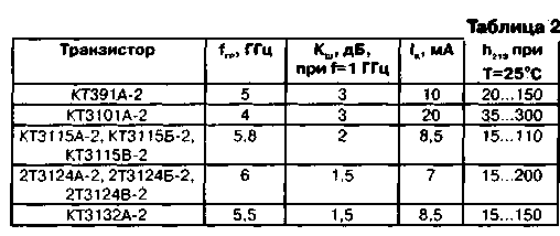 Вопреки распространенному мнению, следует отметить, что коэффициент усиления нельзя считать главным параметром антенного усилителя. Ведь сами телевизоры обладают весьма большим запасом собственного усиления, т. е. Имеют высокую чувствительность, ограниченную усилением. Несколько хуже у них чувствительность, ограниченная синхронизацией. И наконец, наиболее низкая - чувствительность, ограниченная шумами [2]. Следовательно, фактором, определяющим дальний прием, следует принять уровень собственных шумов электронного тракта, а не коэффициент усиления. Другими словами, ограничение возможности приема в первую очередь наступает из-за влияния шумовых помех, а не из-за недостатка усиления сигнала. Влияние шума оценивают по отношению сигнал/шум, минимальное значение которого принято равным 20 [2]. При этом отношении и определяют чувствительность, ограниченную шумами, которая равна напряжению входного сигнала, в 20 раз большему напряжения собственных шумов. Для телевизоров третьего-пятого поколений чувствительность, ограниченная шумами, равна 50... 100 мкВ. Однако при отношении сигнал/шум, равном 20, наблюдаются очень плохие качество изображения и разборчивость только крупных деталей. Для получения изображения хорошего качества следует подать на вход телевизора полезный сигнал, примерно в 5 раз больший, т. е. обеспечить отношение сигнал/шум около 100 [2]. Антенный усилитель должен увеличивать отношение сигнал/шум, а для этого следует усиливать сигнал, а не шум. Но любой электронный усилитель неизбежно имеет собственные шумы, которые усиливаются вместе с полезным сигналом и ухудшают отношение сигнал/шум. Поэтому важнейшим параметром антенного усилителя следует считать его коэффициент шума Кш. Если он недостаточно мал, то повышение коэффициента усиления бесполезно, так как и сигнал, и шум усиливаются в равной мере и их отношение не улучшается. В результате даже при достаточном уровне сигнала на антенном входе телевизора изображение будет поражено интенсивной шумовой помехой (хорошо известный всем "снег"). Для единой оценки шумов многокаскадного тракта существует показатель приведенного к входу коэффициента шума Кш, который равен уровню шума на выходе, поделенному на общий коэффициент усиления, т. е. Кш=Кш.вых/Ку. Так как выходной уровень шума Кш.вых зависит в наибольшей степени от уровня шума первого транзистора, усиливаемого всеми последующими каскадами, шумами остальных каскадов можно пренебречь. Тогда Кш.вых=Кш1Ку, где Кш, - коэффициент шума первого транзистора. Следовательно, получим Кш=Кш1, т. е. приведенный коэффициент шума усилительного тракта не зависит от числа каскадов и общего коэффициента усиления, а равен только коэффициенту шума первого транзистора. Отсюда вытекает важный практический вывод - применение антенного усилителя может дать положительный результат тогда, когда коэффициент шума первого транзистора усилителя меньше коэффициента шума первого каскада телевизора. В селекторах каналов телевизоров пятого поколения применен полевой транзистор КП327А с коэффициентом шума 4,5 дБ на частоте 800 МГц [З]. Следовательно, в первом каскаде антенного усилителя должен работать транзистор с Кш1<4,5 дБ на той же частоте. Причем, чем меньше это значение по сравнению с коэффициентом Кш1 телевизора, тем эффективнее применение усилите