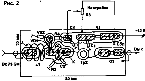 Puc.1 Адаптированная для приема TV схема показана на рис.1. Усилитель является резонансным и перестраивается от 6-го до 12-го каналов резистором R3. Катушка LI - бескаркасная и содержит 5 витков провода ПЭВ 0,7 на оправке диаметром 7 мм. Отвод - от 1-го витка снизу. Надо сказать, что ПТШ очень чувствительны к статическому электричеству, наводкам сети и перегрузкам по входу. Хотя затвор транзистора и соединен с корпусом через катушку L1, попадание на вход X1 даже очень небольшого заряда (от расчески например) вызывает его пробой. Поэтому рискованно подключать случайные антенны, особенно с разрезным вибратором. Центральная жила питающего кабеля должна быть соединена по постоянному току с экраном, а он, в свою очередь, - с несущей мачтой. Печатная плата усилителя показана на рис.2.