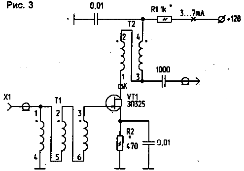 Puc.2 Усилитель можно изготовить широкополосным (рис.3), включив на вход широкополосный трансформатор Т1 с коэффициентом трансформации 1:9. Т2 предназначен для согласования выходного сопротивления усилителя с сопротивлением кабеля, что повышает КПД по сравнению с включением, показанным на рис.1. В усилителе не обязательно применять мощные ПТШ как в [I], вместо них почти так же хорошо работают такие как ЗП325 (АП325). Трансформатор Т1 намотан на кольце К7х4х2 100 НН и содержит 4 витка в три провода ПЭВ 0,2. Т2 - на таком же сердечнике 4 витка в два провода. В обеих схемах К - ферритовая бусинка, одетая на вывод стока для предотвращения самовозбуждения на СВЧ.