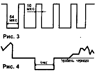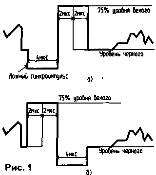 В течение нескольких лет в нашем городе ведется кодированное вещание на 29-м канале. Для реализации достаточно надежной защиты от несанкционированного просмотра программ используется многовариантная адресная система кодирования,разработанная в России и используемая многими коммерческими студиями телевидения. Визуально у кодированной программы отсутствуют строчная и кадровая синхронизации. При просмотре полного телевизионного сигнала при помощи осциллографа удалось обнаружить, что в кодированном сигнале отсутствуют кадровые синхроимпульсы, а вместо строчных импульсов передаются импульсы синхронизации, показанные на рис.1. Количество строк, в течение которых передаются сигналы, показанные на рис.1 а и 16, периодически изменяется, и это является одним из вариантов кодирования. Меняется также и длительность импульсов высокого уровня (75% уровня белого), изображенных на рис.1. Адрес абонента и информация о способе кодирования передается в течение 1 мкс в конце каждой строки. Однако можно сделать дескремблер, способный преобразовывать кодированную программу в стандартный полный цветной телевизионный сигнал (ПЦТС) при использовании на передающей стороне любого из заложенных в системе способа кодирования.