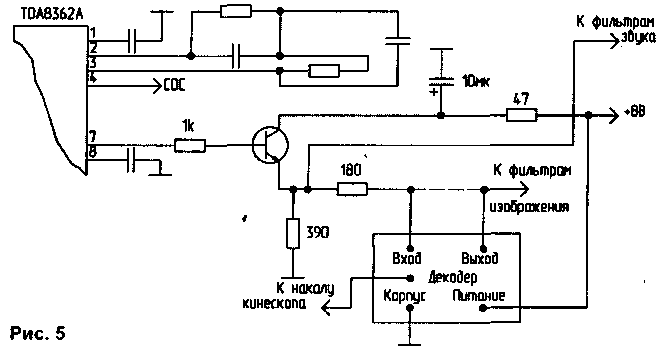 Внешний вид декодированного сигнала показан на рис.4. На транзисторе VT9 собран стабилизатор напряжения питания. Конструкция и детали. Все резисторы, использованные в дескремблере, рассчитаны на мощность 0,125 Вт. Исключением является R26, который дол-жен обеспечивать рассеивание мощности порядка 0,5 Вт. Допустимые отклонения номиналов элементов: С2, С6, СП, R12, R25 - ±5%, остальные - ±20%. Индуктивность L1 намотана на тороидальном магнитопроводе из феррита марки М200НН с габаритными размерами 20х12х4 мм и содержит 110 витков провода ПЭВ 0,1. К добротности катушки L1 не предъявляется жестких требований, поэтому возможна ее намотка на любом другом магнитопроводе. Все транзисторы и диоды могут иметь любые буквенные индексы. Вместо DD1 можно использовать К533ТЛ2: вместо DD2 - К133ЛАЗ, К155ЛАЗ, К533ЛАЗ, К1533ЛАЗ; вместо DD3 - К564ЛА7, К176ЛА7; вместо DD4 - К564ЛЕ10, К176ЛЕ10. Конденсаторы С12, С13 необходимо расположить в непосредственной близости от микросхем DD1, DD2. Подключение к телевизору. Описываемый дескремблер можно подключить практически к любому телевизору (кроме лампового), для этого необходимо включить его в разрыв цепи низкочастотного видеосигнала с размахом 2...4,5 В. В телевизорах ЗУСЦТ, 4УСЦТ, 5УСЦТ дескремблер включается на выходе модуля радиоканала. В телевизорах западного производства, а также в 6УСЦТ дескремблер включается после эмиттерного повторителя, который находится между видеопроцессором и - керамическими полосовыми и режек-торными фильтрами. Пример схемы подключения к телевизору с видеопроцессором TDA8362A показан на рис.5. Пунктиром на рисунке показана цепь, которую необходимо разорвать.