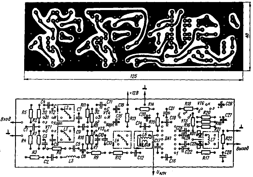 рис. 2 УПЧЗ смонтирован на плате из двустороннего фольгированного стеклотекстолита толщиной 1,5 мм. Чертеж платы и размещение деталей на ней показаны на рис. 3, внешний вид собранного устройства - на рис. 4. Фольга со стороны установки деталей соединена с общим проводом платы, для чего выводы деталей, подключаемые к общему проводу, припаяны к фольге с обеих сторон (отверстия для других выводов раззенкованы со стороны деталей). Плату желательно поместить в металлический экран.