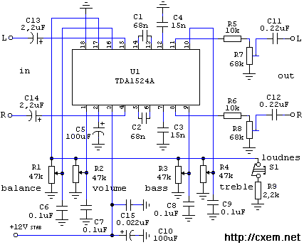 Данная схема реализована на интегральной микросхеме фирмы Philips TDA1524A (А1524А - аналог фирмы RFT). Микросхема представляет собой двухканальный (стереофонический) регулятор громкости, баланса и тембра низких и высоких частот. Также есть loudnes (частотная компенсация).