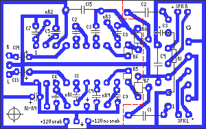 На приведенной здесь печатной плате размерами 50Х31 мм, кроме регулятора громкости, баланса и тембра находиться усилитель мощности, описанный в статье Усилитель мощности на TDA1552Q. Устройства разделены на плате красной пунктирной линией. Слева расположен регулятора громкости, баланса и тембра на TDA1524A, справа - усилитель мощности на TDA1552Q. Элементы усилителя R1 C3 припаиваются со стороны печатных проводников.