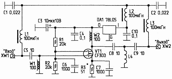 Рис.1. Принципиальная схема магистрального усилителя Усилитель собирают на печатной плате (рис.2) из фольгированного стеклотекстолита толщиной 1,5 мм. Все детали - SMD или обычные, с выводами минимальной длины (для уменьшения паразитных индуктивностей выводов). XW1, XW2 - разъемы типа "F". L4 имеет 2 витка провода ПЭВТЛ-2 d0,36 мм, намотанных на оправке d2 мм, которую после намотки удаляют.