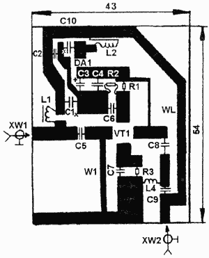 Рис.2. Печатная плата Усилитель помещают в латунный или литой дюралюминиевый корпус. Корпус после настройки герметизируют. VT1 можно заменить на отечественный 3П351А-2 (параметры усилителя при этом должны улучшиться, но такой транзистор найти весьма трудно). При наладке, возможно, придется подобрать резистор R3 по максимальному коэффициенту усиления устройства в целом. Автор: В.ФЕДОРОВ, 398046, г.Липецк, а/я 1341