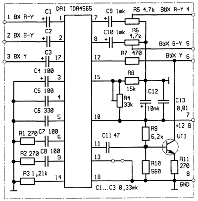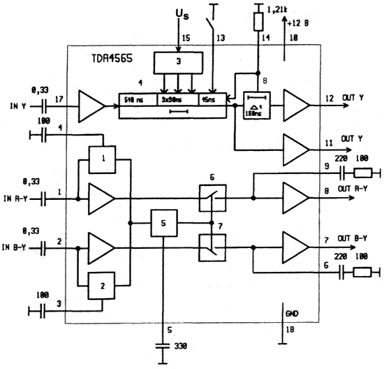 Рис.1. Структурная схема корректора цветовой четкости TDA4565 PPP Гираторная линия задержки 4 состоит из 10 ячеек с задержкой по 90 нс каждая, и одной ячейки с задержкой 45 нс. 6 ячеек по 90 нс объединены в общий блок с временем задержки 6x90=540 нс. За ними следуют три ячейки по 90 нс, которые включаются последовательно с входным блоком электронным коммутатором 3 (три пороговых компаратора с порогами переключения 4,5a1 В, 7,5a1 В и 10,5a1 В), управляемым по выводу 15. Таким образом, увеличивая напряжение на выводе 15, можно пошагово увеличивать время задержки сигнала до 270 мс. Дополнительная задержка 45 нс включается замыканием вывода 13 на общий провод. Между выводом 11 и выводом 12 включена фиксированная задержка 8 еще на 180 нс. Таким образом можно регулировать задержку яркостного сигнала с шагом 45 не с вывода 11 от 540 до 855 не (540 + 270 + 45 = 855), а с вывода 12 - от 720 нс до 1035 нс. Выходные каскады (выводы 11 и 12) выполнены в виде эмиттерных повторителей с генераторами тока в эмиттерной цепи. PPP В обостритель цветоразностных импульсов входят детекторы фронта импульсов 1, 2; формирователь импульсов 5 и коммутаторы 6, 7. Задержка в канале обработки цветоразностных сигналов составляет примерно 150 нс (от 100 до 200 нс). В моменты фронтов и спадов цветоразностных сигналов, путем их дифференцирования и выпрямления на выходах детекторов формируются импульсы положительной полярности, амплитуда которых пропорциональна скорости изменения исходных сигналов. После фильтра ВЧ и ограничителя 5 эти импульсы управляют двумя одинаковыми каналами-обострителями цветоразностных сигналов, выполненными в виде электронных ключей 6 и 7. Они коммутируют тракты R-Y и B-Y. К выходам ключей подсоединены запоминающие конденсаторы. "Суммарное" управление ключами обеспечивает одновременную смену цветов в обоих каналах при коротких цветовых переходах. Конденсаторы на выводах 1 и 3 ИМС предназначены для подавления составляющих за пределами полосы частот цветоразностных сигналов, в том числе и остатков поднесущих сигналов цветности, что улучшает отношение сигнал/помеха. Выходные каскады (выводы 7 и 8) выполнены в виде эмиттерных повторителей с каскодными генераторами тока в эмиттерной цепи. PPP Номиналы внешних элементов обвязки указаны в соответствии с типовой схемой включения. Более подробно о работе корректора можно прочитать в [2]. PPP Схема включения корректора (рис.2) заимствована из телевизоров "Горизонт". Она отличается наличием подстроечных резисторов R5, R6 [3] по выходам сигналов B-Y и R-Y, с помощью которых настраивают цветовой баланс. В современных телевизорах необходимость в таких регуляторах отпадает, т.к. в них баланс белого осуществляется автоматически. От типовой приведенная схема включения отличается номиналами RC-це-пей, постоянная времени которых определяет длительность фронта, и наличием активного источника тока (АИТ) на транзисторе VT1. На вход АИТ через дифференцирующий конденсатор емкостью 47 пФ поступает яркостный сигнал с опережением на 180 нс. АИТ включен параллельно внутреннему генератору тока в эмиттерной цепи выходного каскада. При таких номиналах RC-цепей длительность цветовых переходов (около 150 нс) примерно соответствует длительности яркостных перепадов в канале яркости (около 6 МГц).
