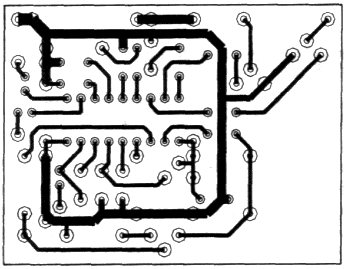 Рис.2. Схема включения корректора PPP Резистор R3 должен быть подобран с точностью a1%, т.к. время задержки пропорционально его сопротивлению. В случае использования микросхем TDA4565A сопротивление R3 - 1,15 кОм (параллельно резистору 1,21 кОм включается 27 кОм). PPP Когда движок резистора R4 находится в крайнем верхнем положении, включена одна дополнительная линия задержки 90 нс, в среднем положении - две по 90 нс (суммарная задержка - 180 нс), в крайнем нижнем положении - три (270 нс). PPP Конструкция и детали. Чертеж печатной платы дополнительного субмодуля размерами 60x45 мм изображен на рис.3, а сборочный чертеж - на рис.4. Электролитический конденсатор С12 - типа К53-4 на напряжение 20 В, остальные - К50-35. Неполярные конденсаторы - типа К22-5. Подстроечные резисторы - СПЗ-38а.