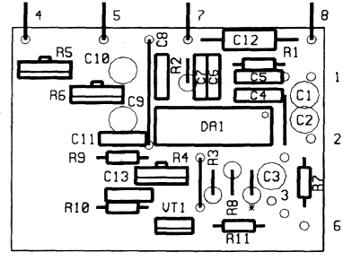 Рис.4. Сборочный чертеж PPP Перед монтажом субмодуля необходимо впаять в точки 4, 5, 7 и 8 проволочные выводы длиной около 10 мм и выпаять из основной платы элементы R38, R39, R42, R55, С31, С32, СЗЗ, VT2, VT3, а также линию задержки ВТ2 (ЛЗЯС-0,3/1000) и элементы ее согласования R63 и R88. Резистор R60 сопротивлением 150 Ом необходимо заменить на резистор сопротивлением 10 Ом, конденсатор С48 емкостью 22 мкФ - на 0,047 мкФ. Рядом с точкой соединения R60 и С28, а также на краю платы в "общем проводе" на одной линии с верхними выводами (правыми по схеме) конденсаторов С31 и СЗЗ просверливаются отверстия для подключения цепей питания (выводов 4 и 7) субмодуля. PPP Перед монтажом субмодуля вывод KN4 необходимо укоротить на 2...3 мм, а конденсатор С28 пригнуть к плате. Выводы 4 и 5 субмодуля впаивают непосредственно в основную плату вместо верхних выводов демонтированных конденсаторов С31 и СЗЗ, а точки 1 и 2 соединяют гибкими проводами (длиной 55 и 70 мм соответственно) с нижними выводами этих конденсаторов. Вывод 3 субмодуля подключают экранированным проводом (150 мм) вместо правого вывода демонтированного резистора R88, а вывод 6 - гибким проводом (55 мм) на место вывода 2 демонтированной линии задержки. PPP Наладка. При наладке подают сигнал "цветные полосы" с выхода соответствующего генератора на контакт 1 XN2(A1), предварительно сняв перемычку. Подавать сигнал на ВЧ-вход (из-за возможных помех), а также использовать сигнал телецентра (из-за повторов изображения) не рекомендуется. Линию задержки регулируют с помощью резистора R4 и перемычки между выводом 13 DA1 и общим проводом по минимальной зоне цветовых переходов по горизонтали. Цветовой баланс устанавливается резисторами R5 и R6. Оптимальный размах сигнала R-Y - около 1,05 В (максимальный - 1,5 В), сигнала B-Y - около 1,33 В (1,9 В максимум). PPP В некоторых телевизорах, возможно, субмодуль декодера СД-41 заменен на более современный, например, "Электроника 016" или аналогичный с регуляторами уровней сигналов по выходам. В таких блоках эти регуляторы необходимо выставить в положение, соответствующее максимальному выходному сигналу, а оптимальные уровни выставлять с выходов корректора цветовой четкости. PPP При тщательной настройке корректора наблюдается четко выраженный эффект повышения четкости и чистоты изображения, оно приобретает рельефность и чистоту. При недостаточной яркости может понадобиться подстройка режима входного каскада гираторной линии задержки с помощью резистора сопротивлением 220...510 кОм, включенного между выводами 17 и 16 DA1. Это определяется по наилучшему воспроизведению крайней левой белой полосы [3]. Указанный резистор на схеме не показан, но на плате предусмотрено место для его установки. Источники